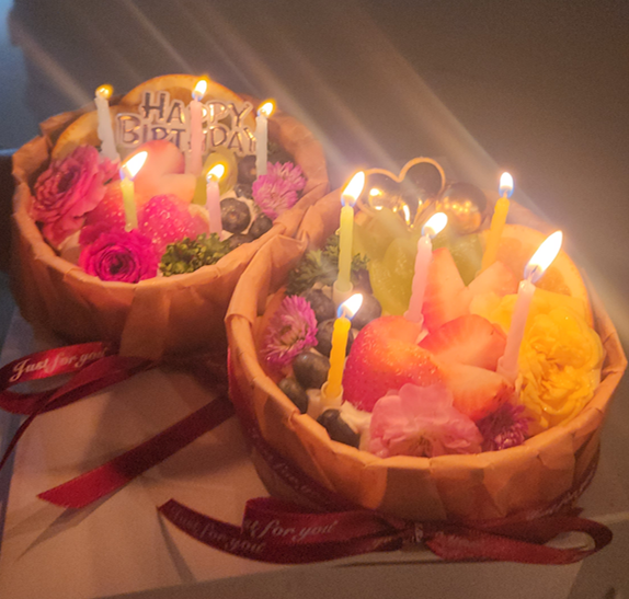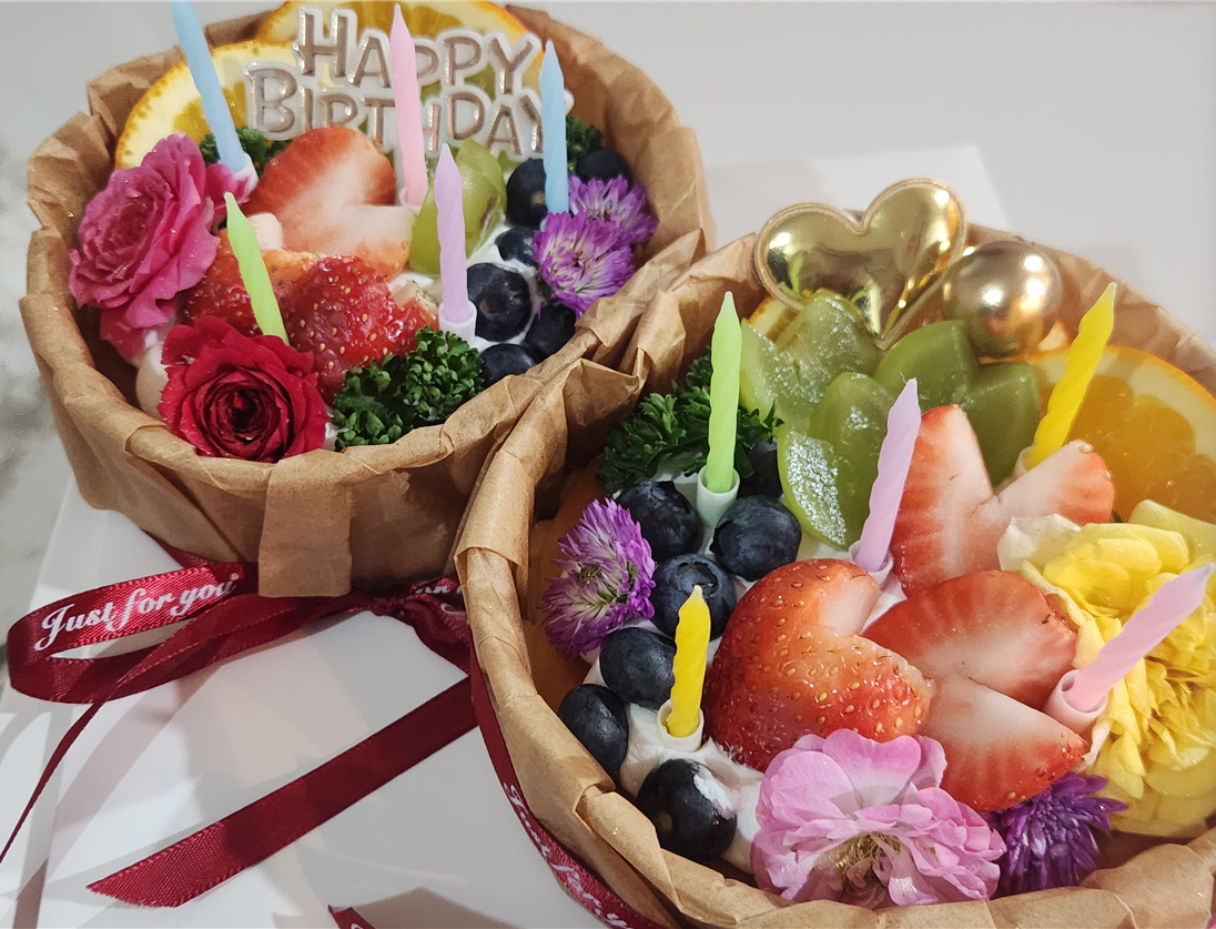 사이즈는 두 손을 맞대어 그린 원 모양이었고 각종 과일이 올려져 있었습니다. 포장 아래의 빵은 치즈케이크였습니다.
