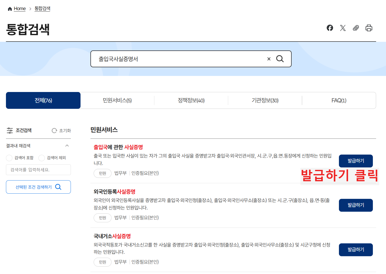 민원서비스에 출입국에 관한 사실증명에 발급하기를 클릭합니다.