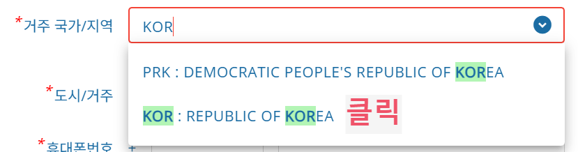 ** 거주 국가 입력시 한글로 '대한민국' 이나 '한국'이라고 치면 오류가 납니다. 영어로 KOR 이라고 치면 'REPUBLIC OF KOREA' 를 클릭합니다.