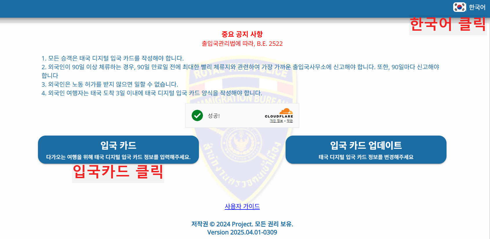 태국에 입국하는 모든 외국인은 입국 전에 TDAC를 작성해야 합니다. 이 시스템은 모든 교통 수단(항공, 육로, 해상)을 통해 입국하는 방문객에게 적용됩니다. 태국에 입국하기 3일전에 반드시 제출해야 합니다.