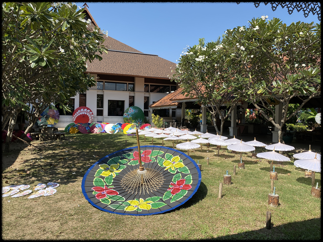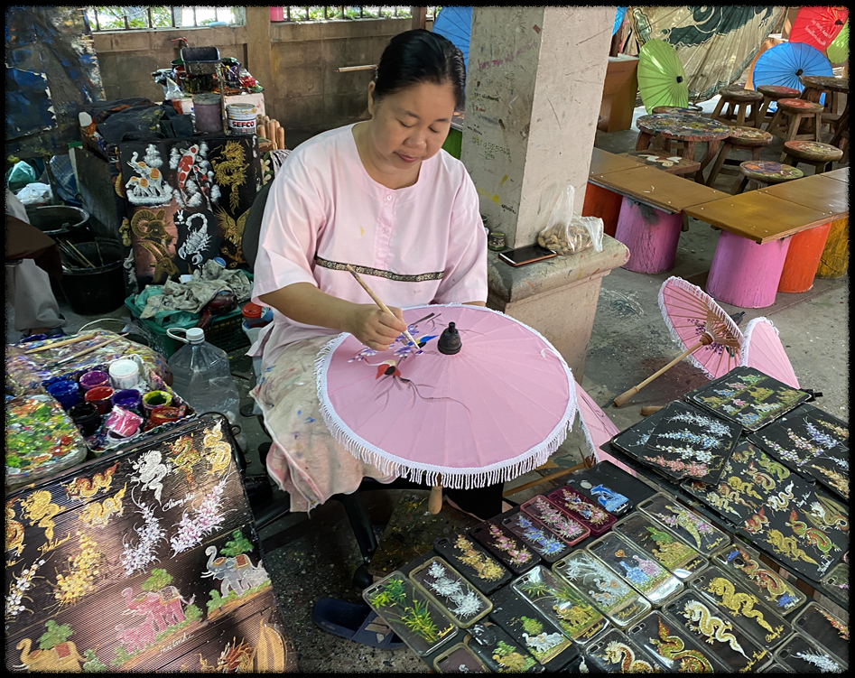 사 종이는 뽕나무 껍질을 삶고 두드려 만든 천연 종이로, 여기에 천연 안료나 아크릴 물감으로 연꽃, 새, 태국 풍경 등 다양한 전통 문양을 손으로 그려 넣습니다. 완성된 우산은 방수 처리를 거쳐 판매된다고 합니다.