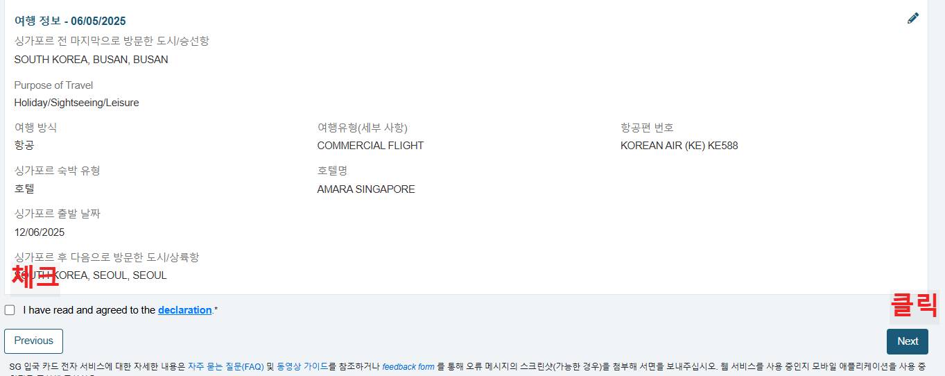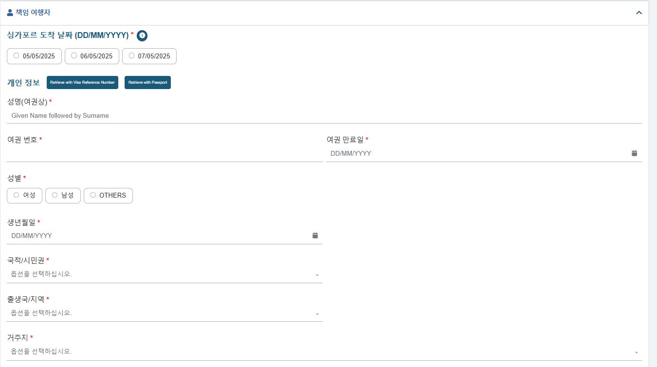 싱가포르 입국하는 날짜를 선택 하고 개인 정보를 입력합니다.