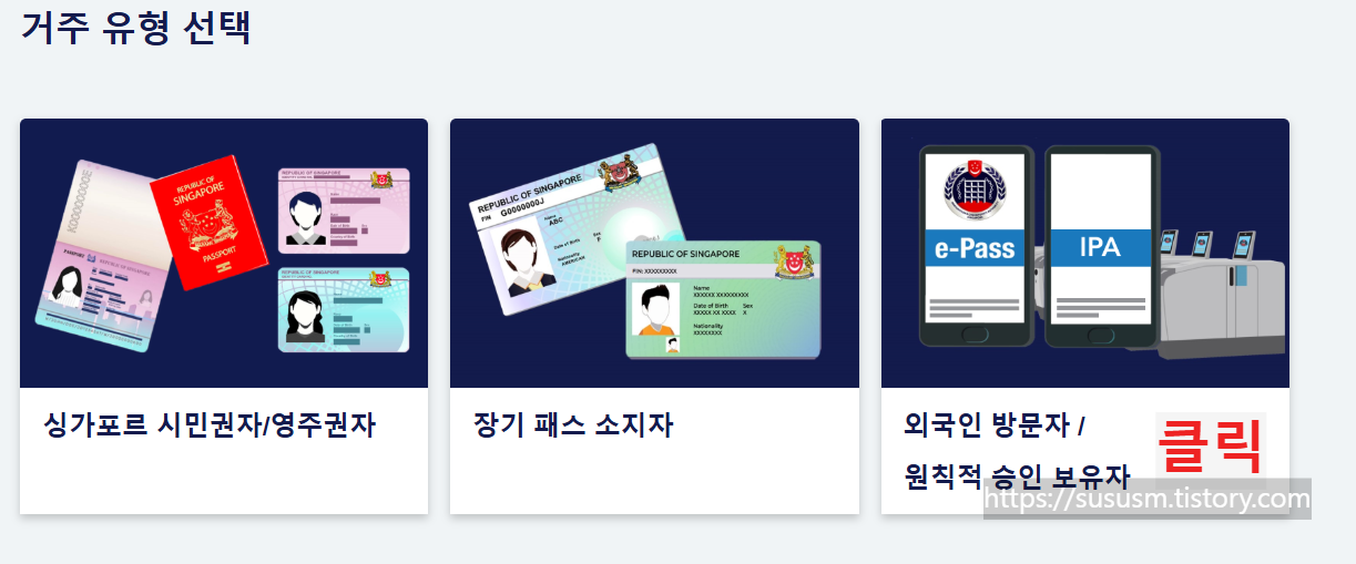 싱가포르에 거주하는 분은 시민권자 / 영주권자를 클릭하고 단순 여행자의 경우 외국인 방문자 / 원칙적 승인 보유자를 클릭합니다.