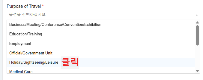 관광차 방문한 경우라면 'Holiday/Sightseeing/Leisure를 클릭합니다.