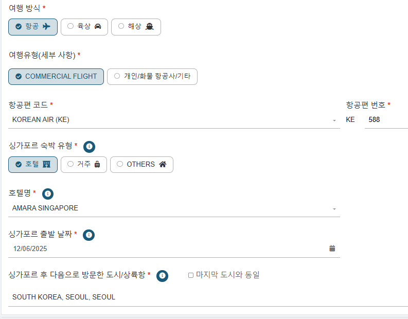 싱가포르 입국하는 날짜를 선택 하고 개인 정보를 입력합니다.